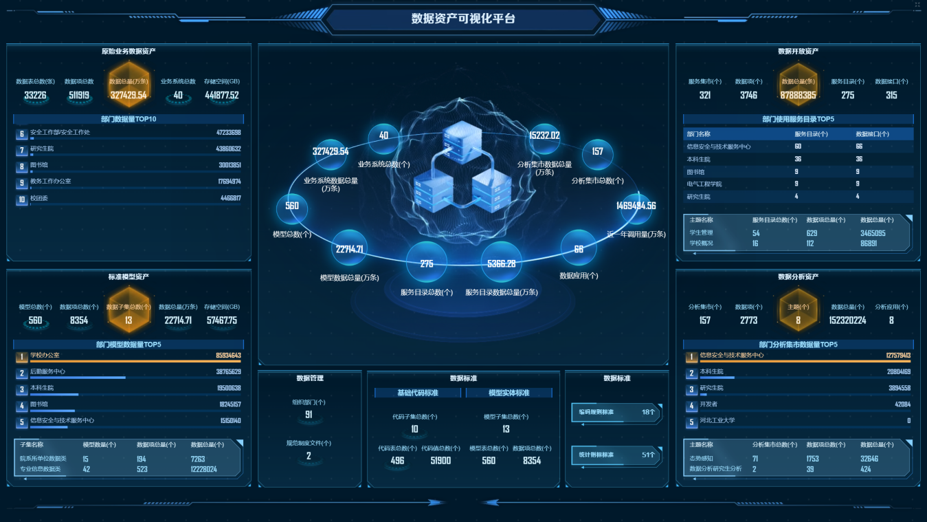 数据资源治理加速推进。持续加强数据标准化,构建校级数据中心,对校内各类数据及时进行采集、汇聚、分析、转换、清洗、共享等,强化数据治理闭环。五年内,统筹校内15个部门,累计梳理33个业务系统,67个数据源,集成3万多张表,30亿余条数据;构建标准模型层,形成561张表,11个基础代码,2.2亿余条数据,形成校级统一数据服务底座;通过接口和中间库方式为全校各部门的49个业务系统,提供315个API接口,累计调用1777万余次,数据152亿余条。